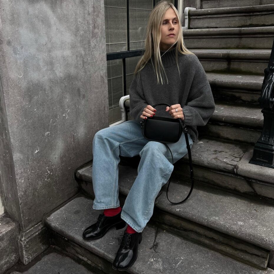 빨간 양말의 장점은 이뿐만이 아닙니다. 올겨울 트렌드 컬러인 그레이, 그리고 카멜과도 완벽하게 어우러지거든요. 그레이 니트 톱에 연청 팬츠의 조합이 어딘가 따분하게 느껴진다면, 새빨간 양말을 슬쩍 얹어보세요.