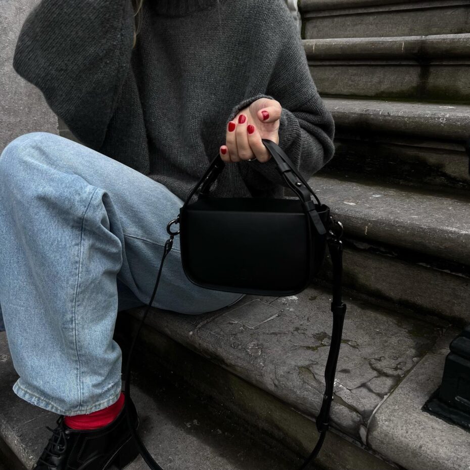 룩은 전부 블랙으로, 그리고 백과 양말의 컬러는 레드로 통일하는 센스를 발휘할 수도 있습니다.