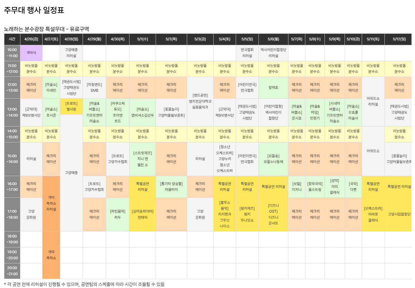 노래하는 분수대 주무대 행사 일정표 ( 유료 구역 )