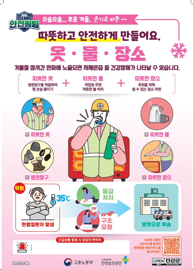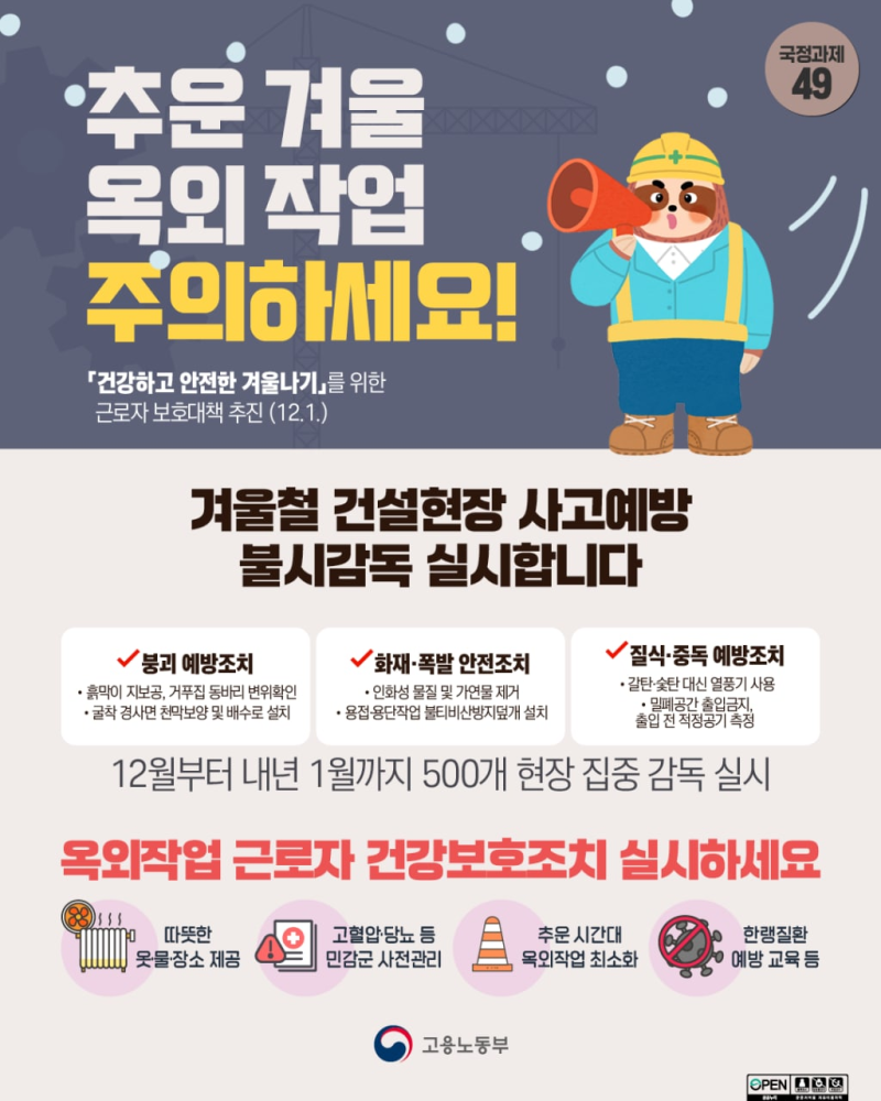 고용노동부(장관 이정식)는 겨울철을 맞아 한파로 인한 재해를 예방하기 위해 건설현장 등 옥외 작업이 많은 사업장을 대상으로 불시감독을 실시하는 등 근로자 보호 대책을 집중 추진할 계획이라고 밝혔습니다.